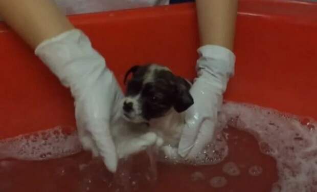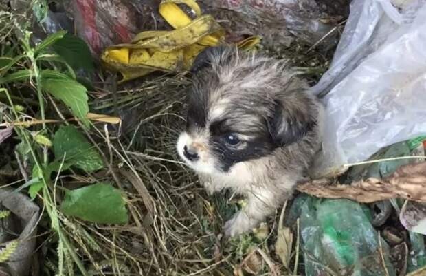 Как-то раз женщин-волонтер исследовала малонаселенный и частично заброшенный район города. На одной из улиц она услышала жалобное скуление, раздающееся на помойке. Подойдя поближе, женщина увидела маленького замызганного щеночка, роящегося в груде мусора в поисках чего-нибудь съестного.